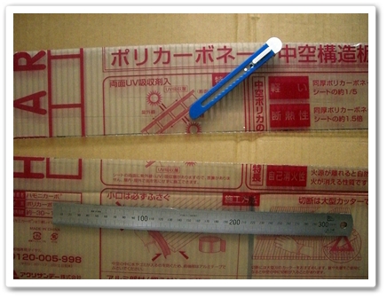 室内で、ダンボールを敷いて定規をずらしながら何回か刃を入れて切っていきました。